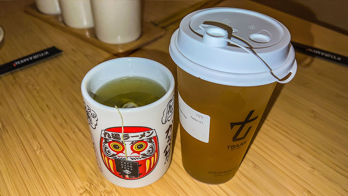 To go with the gyoza, we ordered a Hot Matcha Genmaicha — earthy, nutty, and comforting — along with a Four Seasons Iced Green Tea from TBaar next door. The combination worked really well: one warm tea to settle into the meal and one bright iced tea to refresh between bites.
